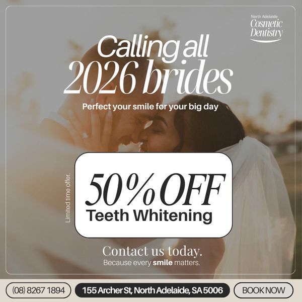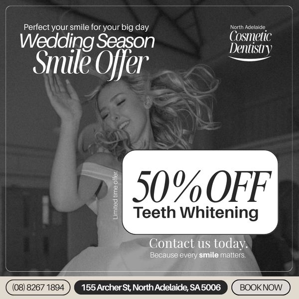 Wedding season is here, and that means cameras, laughter, and plenty of reasons to smile. At North Adelaide Cosmetic Dentistry, we know how important it is to feel confident and radiant on your big day... whether you’re the bride, groom, part of the wedding party, or simply attending to celebrate love. We're offering a limited-time 50% off professional teeth whitening, designed to brighten your smile and enhance your natural glow in just one visit.